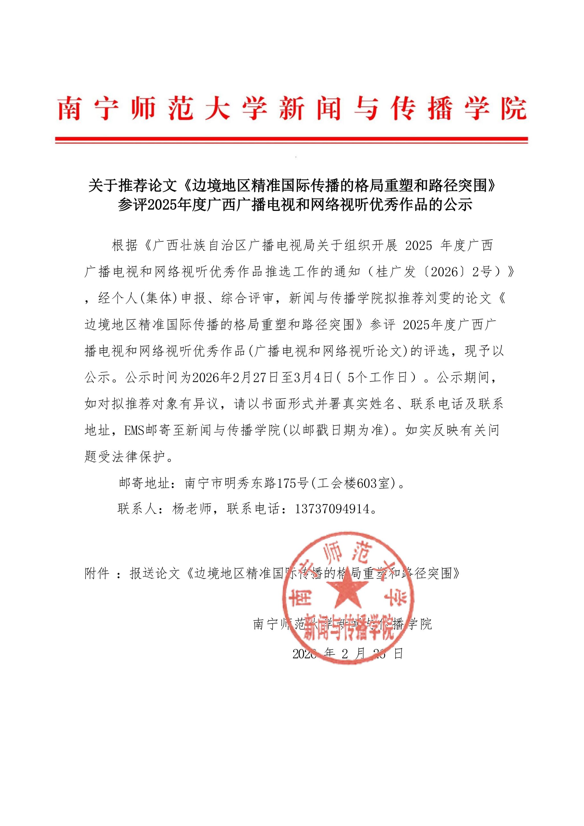 关于推荐论文《边境地区精准国际传播的格局重塑和路径突围》参评2025年度广西广播电视和网络视听优秀作品的公示