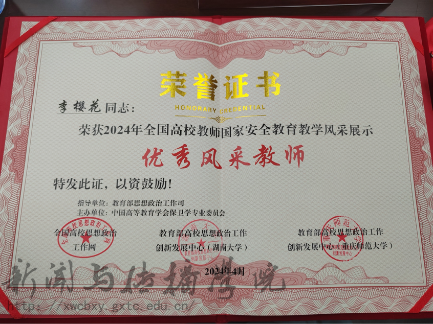 4月10日至12日,由教育部思想政治工作司指导,中国高等教育学会保卫学专业委员会、全国高校思想政治工作网、教育部高校思想政治工作创新发展中心联合主办的“2024年高校教师国家安全教育教学风采展示”在重庆师范大学举行。经过激烈角逐,betway必威西汉姆联官网团委书记李樱花老师在2024年高校教师国家安全教育教学风采展示活动中荣获“国家安全教育教学优秀风采教师”,实现了我校教师在全国国家安全教育教学竞赛成绩的新突破。