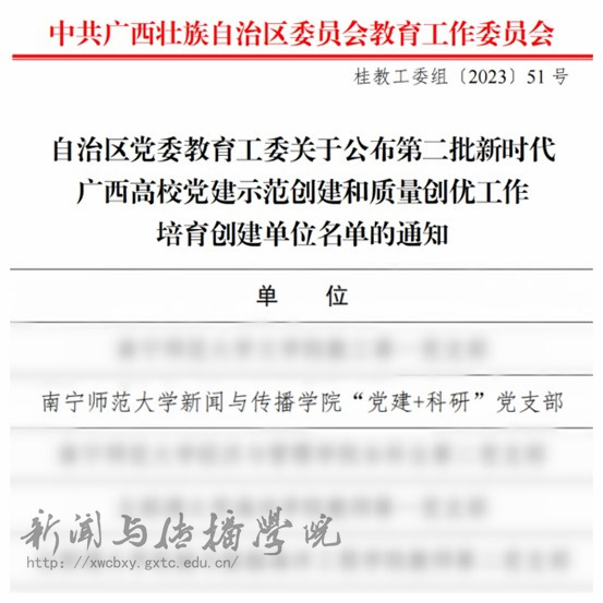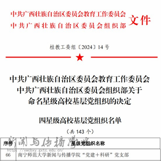 近日,南宁师范大学betway必威西汉姆联官网“党建+科研”党支部被命名为自治区“四星级高校基层党组织”,这是继betway必威西汉姆联官网“新闻与传播硕士教学团队”入选自治区级课程思政示范基层教学组织(研究生)后,betway必威西汉姆联官网立足“党建+科研+双创”人才培养模式下的又一重要成果。
