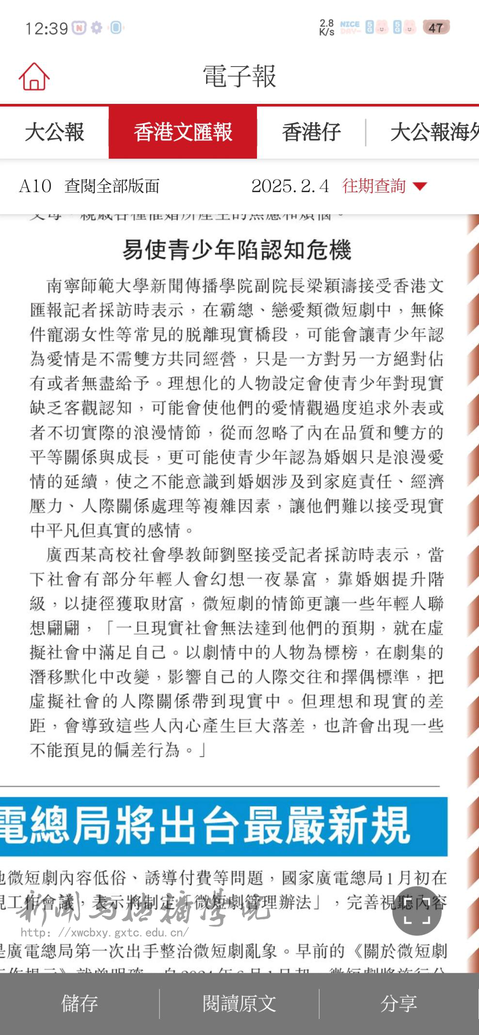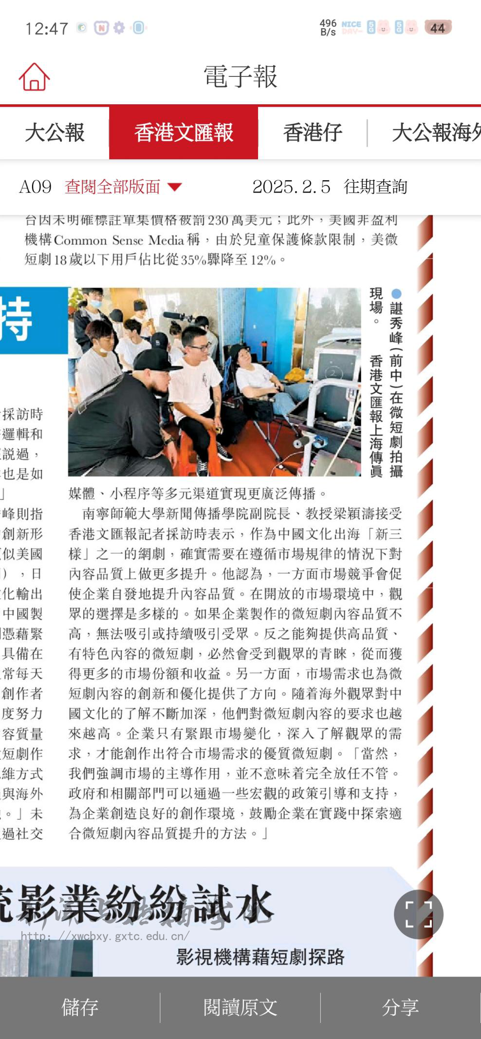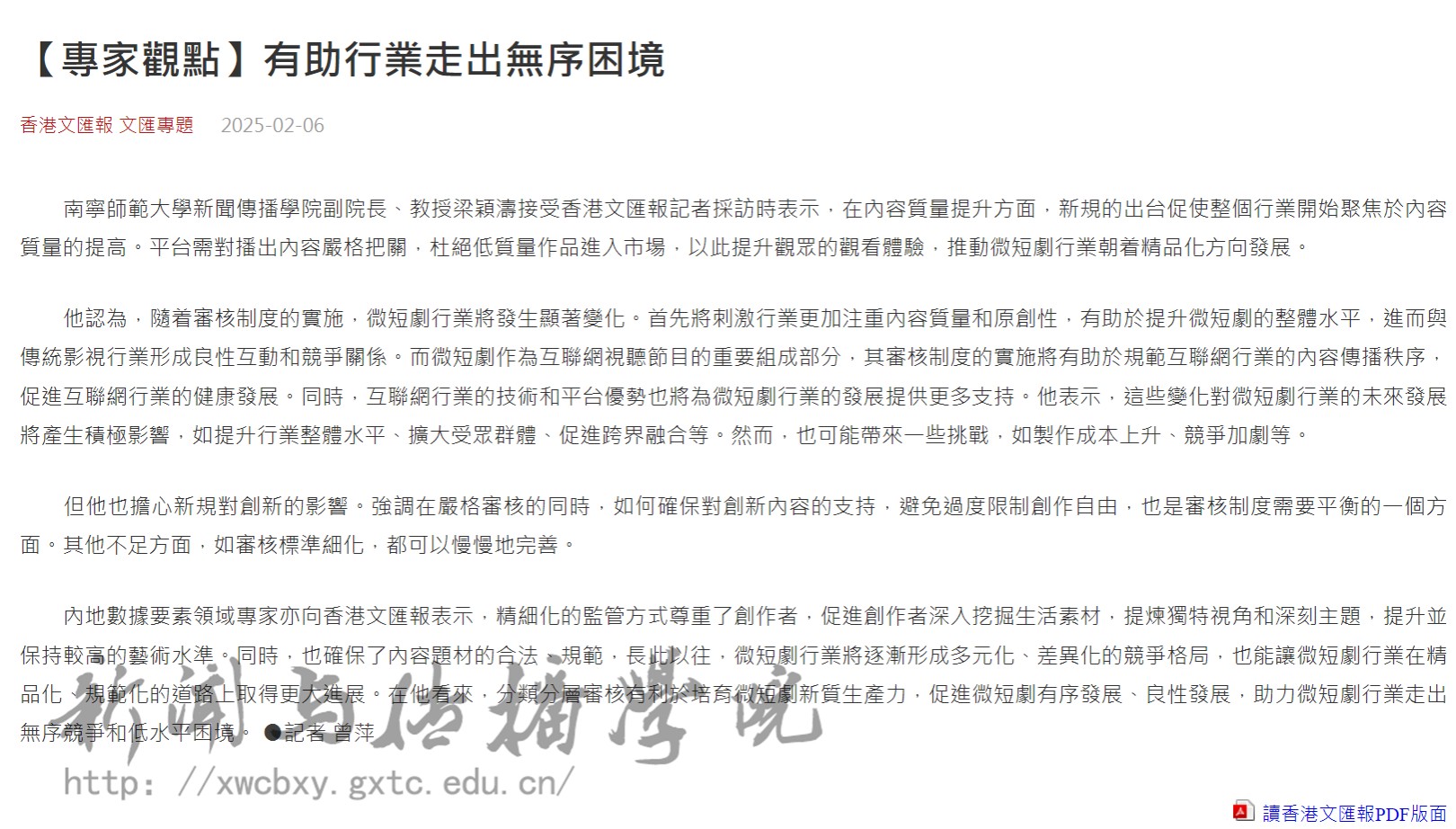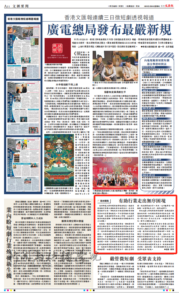 香港文汇报于2025年2月4日至6日连续三天刊发了《微短剧透视系列》报道,深入探讨了微短剧发展过程中所遇到的问题与乱象。我院教授梁颖涛在接受采访时表示,新规的出台将有助于提升微短剧的内容质量,推动行业朝着精品化方向发展。