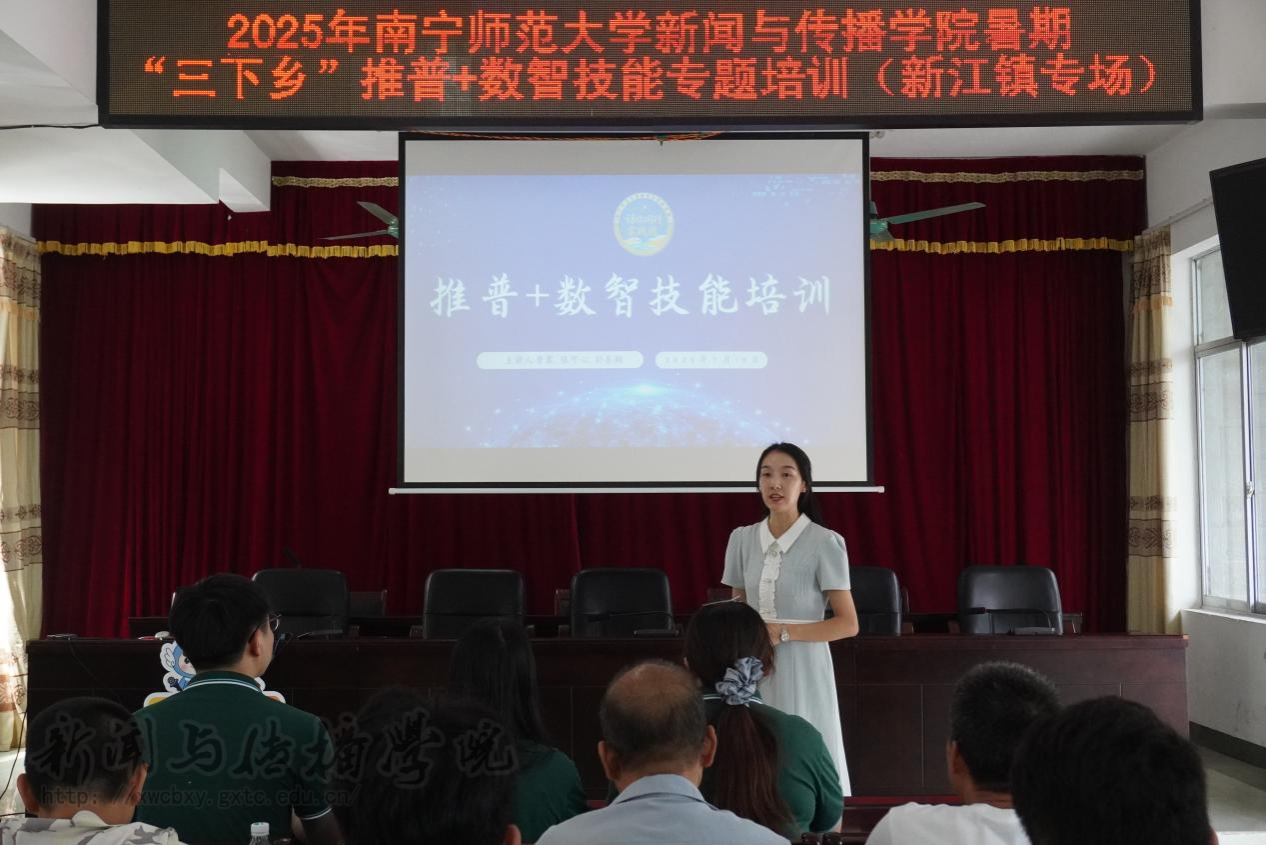 7月15日上午,betway必威西汉姆联官网暑期“三下乡”“语”你同行实践团在邕宁区新江镇人民政府会议室开展“推普+数智技能培训”专题会。新江镇团委书记邓媛方、betway必威西汉姆联官网团委书记李樱花,以及新江镇各村干部群众代表和 “语”你同行实践团成员到场参加。会议由新江镇团委书记邓媛方主持。本次培训会分为“直播技巧”“短视频拍摄”和“无人机使用”三部分。