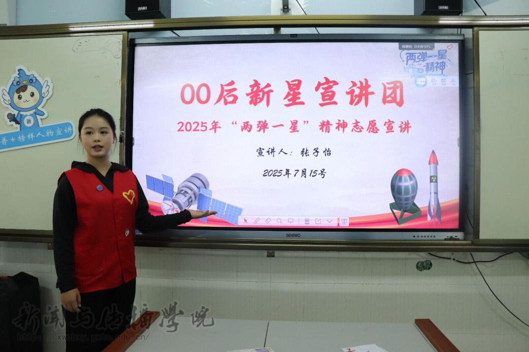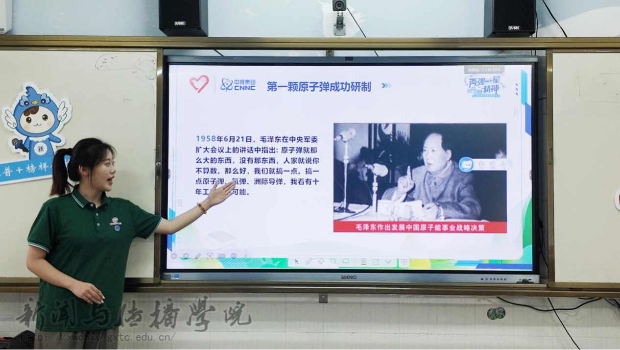 宣讲组成员高艺涵通过“视频+现场讲解”的形式将“两弹一星”元勋王淦昌、郭永怀隐姓埋名、以身报国的奋斗史诗娓娓道来。高艺涵在讲解过程中为同学们播放了中国第一颗原子弹爆炸时的视频,当原子弹那震撼寰宇的蘑菇云在屏幕上轰然腾起,传递着磅礴的力量,孩子们清澈的眼眸中映出惊叹与自豪的光。一位小同学在观看视频后坚定表示,自己要向“两弹一星”元勋王淦昌、郭永怀学习,为国家做出贡献,做一个对社会有用的人。