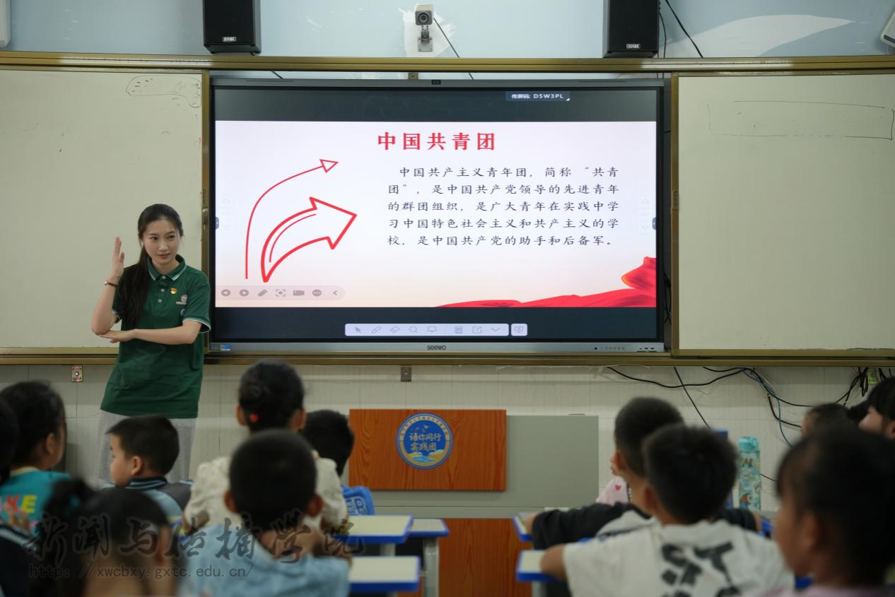 宣讲组成员朱敏祺作为学生党员,在党史团史传播的课堂中讲解了中国共产党和共产主义青年团的相关知识,带领同学们认识了党徽、党旗和团徽、团旗,并且强调了中国共产党和中国共青团之间的关系。朱敏祺还为同学们播放了与抗美援朝战争相关的动画片,她讲述了黄继光、邱少云这两位红色模范人物的抗战故事,阐述了抗美援朝战争对于捍卫新中国和平与尊严的伟大意义。通过课堂,宣讲组成员让伟大抗美援朝精神能够跨越时空,在新时代少年心中焕发出催人奋进的力量。