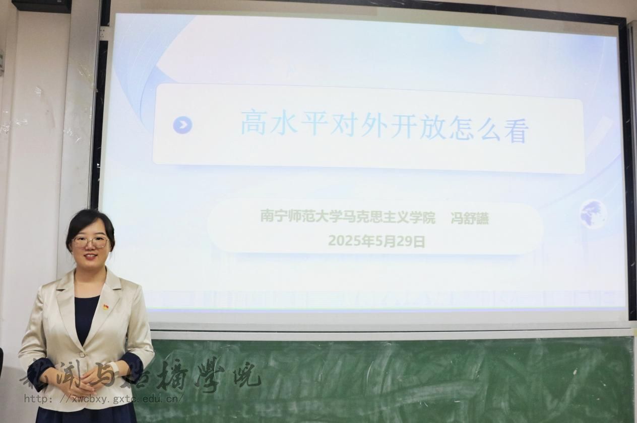 课堂上,冯老师结合生活实际和大量时政新闻,带领同学们进一步学习了解高水平对外开放的相关内容。在回顾对外开放历史进程的基础上,冯老师结合中国加入世贸组织、建设自贸试验区、推进“一带一路”倡议等举措,分析了我国更大范围、更宽领域、更深层次的对外开放格局。她通过实际案例,阐述了高水平对外开放在提升贸易水平、提高出口产品质量、服务内外双循环等方面的优势。随后,冯老师依、《中共中央关于进一步全面深化改革、推进中国式现代化的决定》《2025年政府工作报告》等重要文件,讲解了我国将以开放促改革促发展、建设更高水平开放型经济新体制的具体方向。