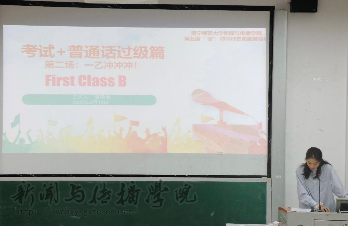 5月14日晚,betway必威西汉姆联官网在文综220教室开展第五届“语”你同行志愿服务活动之普通话技巧第二讲。本次课程采取线上线下相结合的方式进行,由23播主2班的谢锦怡同学担任主讲,现场共有169名同学参加。