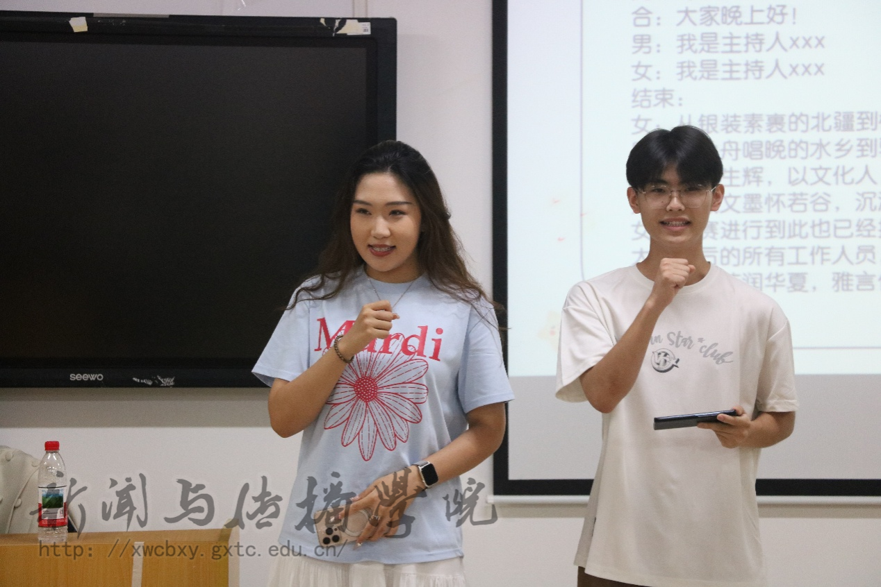 课上,两位主讲人从主持基本功切入,围绕发声训练展开教学。助教通过示范“数枣法”“绕口令”等练习方法,引导同学们掌握科学发声技巧,强化唇舌力度与气息控制。随后,主讲人提到,要重视主持仪态管理,男生主持所穿西装要得体整洁、站姿挺拔,女生主持可穿亮色礼服或简约西装裙,通过服饰展现主持的风格风采。此外,课堂设置“中华经典诵读比赛”、“家乡的味道”等模拟主持环节,让同学们从实践中汲取经验。