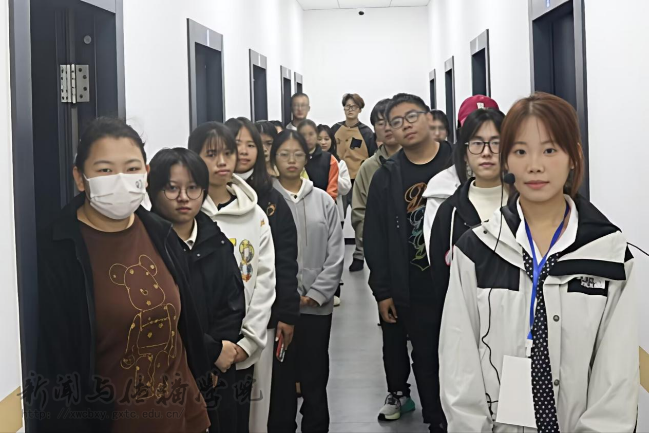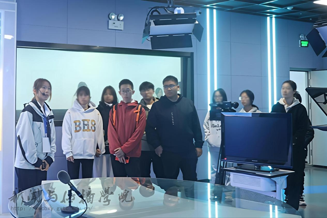 活动首先在演播厅开展。讲解员李思潼为同学们系统介绍了虚拟场景节目制作的全流程。惠旋老师与唐兰老师现场邀请同学们登上主持台,亲身体验新闻播报,感受镜头前的工作状态。同学们走进录音室了解录音设备操作流程,并在工作人员的指导下在录音间完成音频片段的录制与素材录入,切实体会声音创作的全过程。最后,网台工作人员王烁涵为同学们细致讲解了网台的职能定位与运营机制,带领大家参观网台往期新闻报道等成果作品,让同学们对网台工作形成了更为全面的认识。