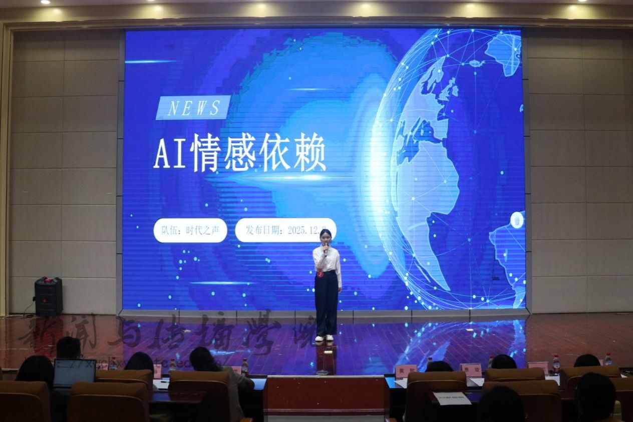 以“智启采访 AI见未来”为核心主题,大赛共设置“团队介绍”和“情景模拟采访”两大环节,重点考察选手的采访对话能力、批判性思维与新闻采写实践素养。第一环节限时3分钟内完成,各团队围绕“AI情感依赖”“大学生AI使用现状”等主题展开创意讲解。第二环节则是各团队结合预设场景与议题,还原专业采访全流程,通过角色互动展现AI对传媒业态的重塑。此环节重点考验选手的临场沟通、问题设计与情绪引导能力,各团队的真实感与思辨性获得评委认可。
