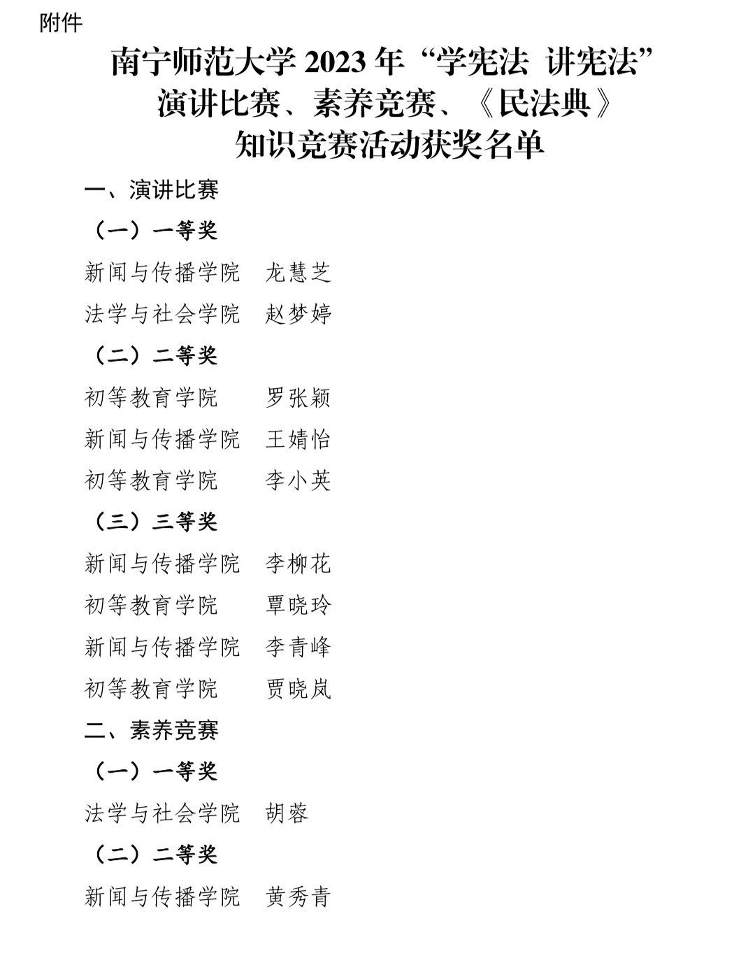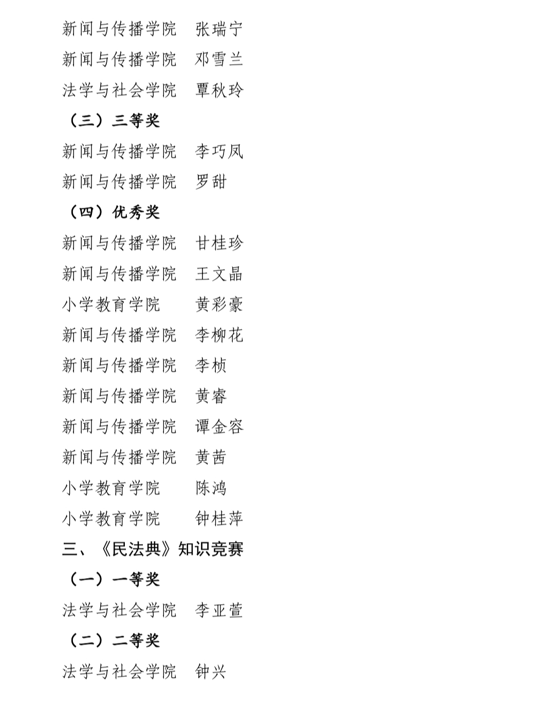 活动分为演讲比赛、素养竞赛、《民法典》知识竞赛三个项目,经过激烈的角逐,演讲比赛中,我院龙慧芝同学获一等奖,王婧怡同学获二等奖,李柳花、李青峰同学获三等奖;素养竞赛中,黄秀青等3位同学获二等奖,李巧凤等2位同学获三等奖,甘桂珍等7名同学获优秀奖;《民法典》知识竞赛中,邓雪兰等3位同学获三等奖,李巧凤等5位同学获优秀奖。