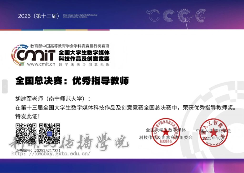 据悉,该赛事由中国人工智能学会与全国大学生数字媒体科技作品及创意竞赛组委会联合主办,哈尔滨工业大学等 45 所知名高校共同承办,是国内数字媒体领域极具权威性与影响力的全国性赛事。赛事历经校赛、省赛、全国复评等多轮严格评审,层层筛选出兼具创新性与实践性的优秀作品晋级全国总决赛。在总决赛现场,学院参赛团队与北京大学、清华大学、中国传媒大学、北京电影学院等高校团队同台竞技,通过作品现场展示、专业答辩等环节的激烈角逐,最终脱颖而出斩获一等奖,充分展现了学院学子过硬的创新实践能力与默契的团队协作精神。此次参赛过程中,学院得到了创新创业学院施夏珍老师的细心指导,给予专业建议,助力学子们在备赛路上少走弯路,以最佳状态迎接挑战。