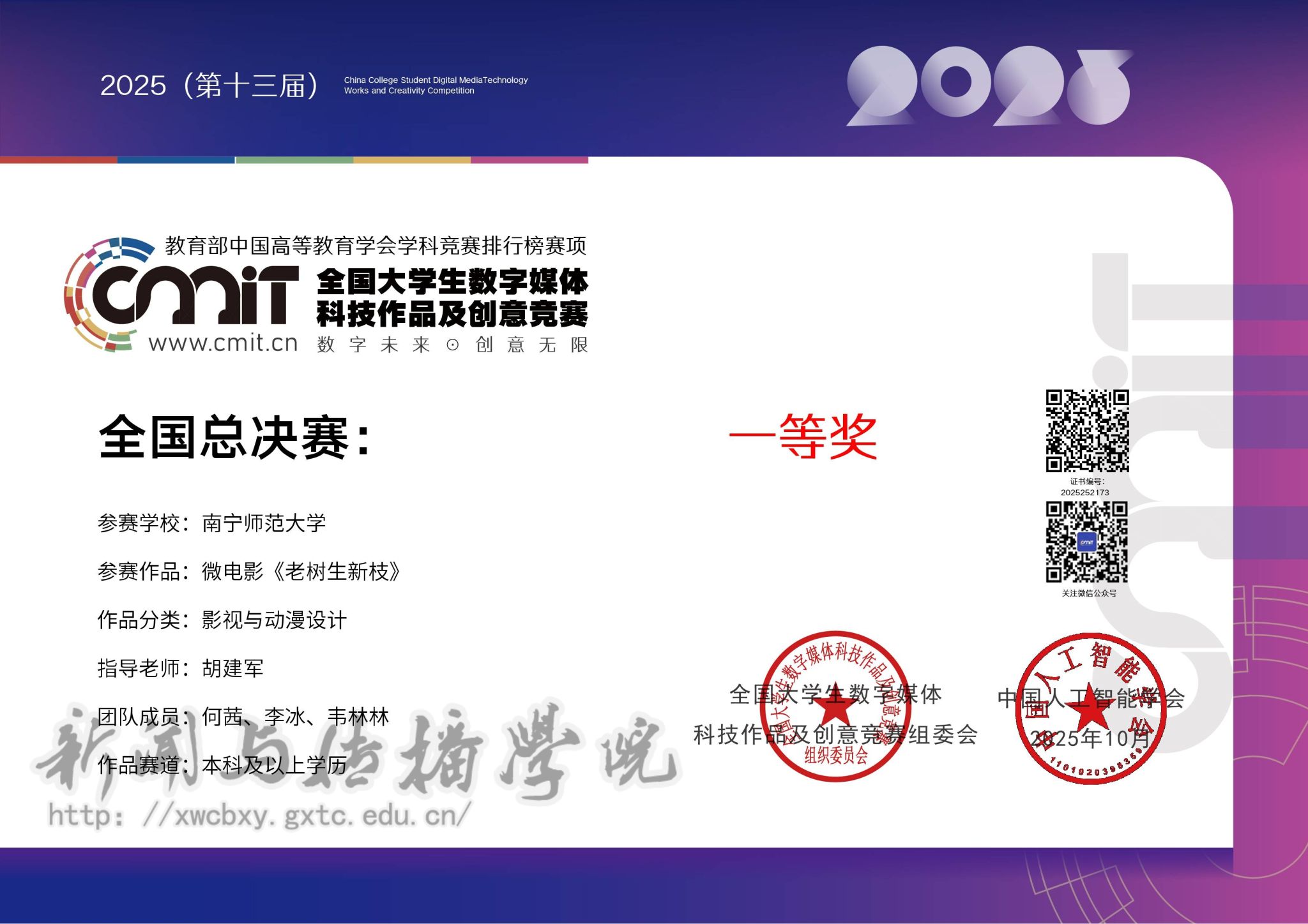 10月24日,betway必威西汉姆联官网本科生何茜、李冰、韦林林创作的微电影作品《老树生新枝》在2025年第十三届全国大学生数字媒体科技作品及创意竞赛全国现场总决赛中荣获全国总决赛一等奖;指导教师胡建军老师因悉心指导与专业引领,斩获全国总决赛优秀指导教师奖。这是学院广播电视学专业师生首次征战该赛事,也是学院在全国性专业学科竞赛中实现的又一重要突破。