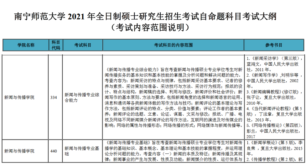 全国统考和联考科目的命题工作由教育部考试中心统一组织。统考科目考试大纲由教育部考试中心统一编制;联考科目考试大纲由教育部考试中心或教育部指定相关机构组织编制。我校初试科目中的自命题科目考试大纲详见《南宁师范大学2021年全日制硕士研究生招生考试科目考试大纲(含参考书目)》(附件2)。